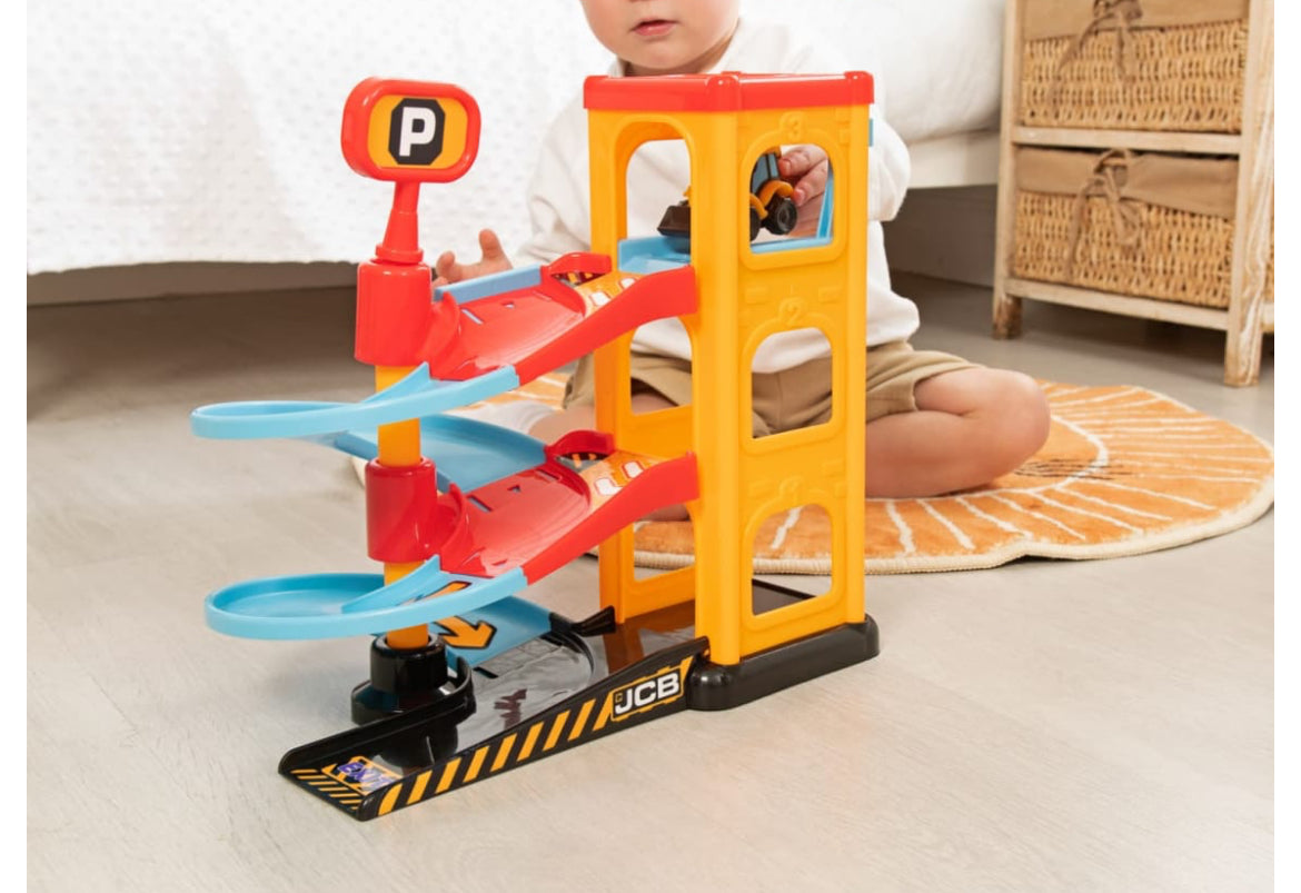 Features a lift that carries JCB vehicles between different floors and releases them onto a track or into a parking spot.